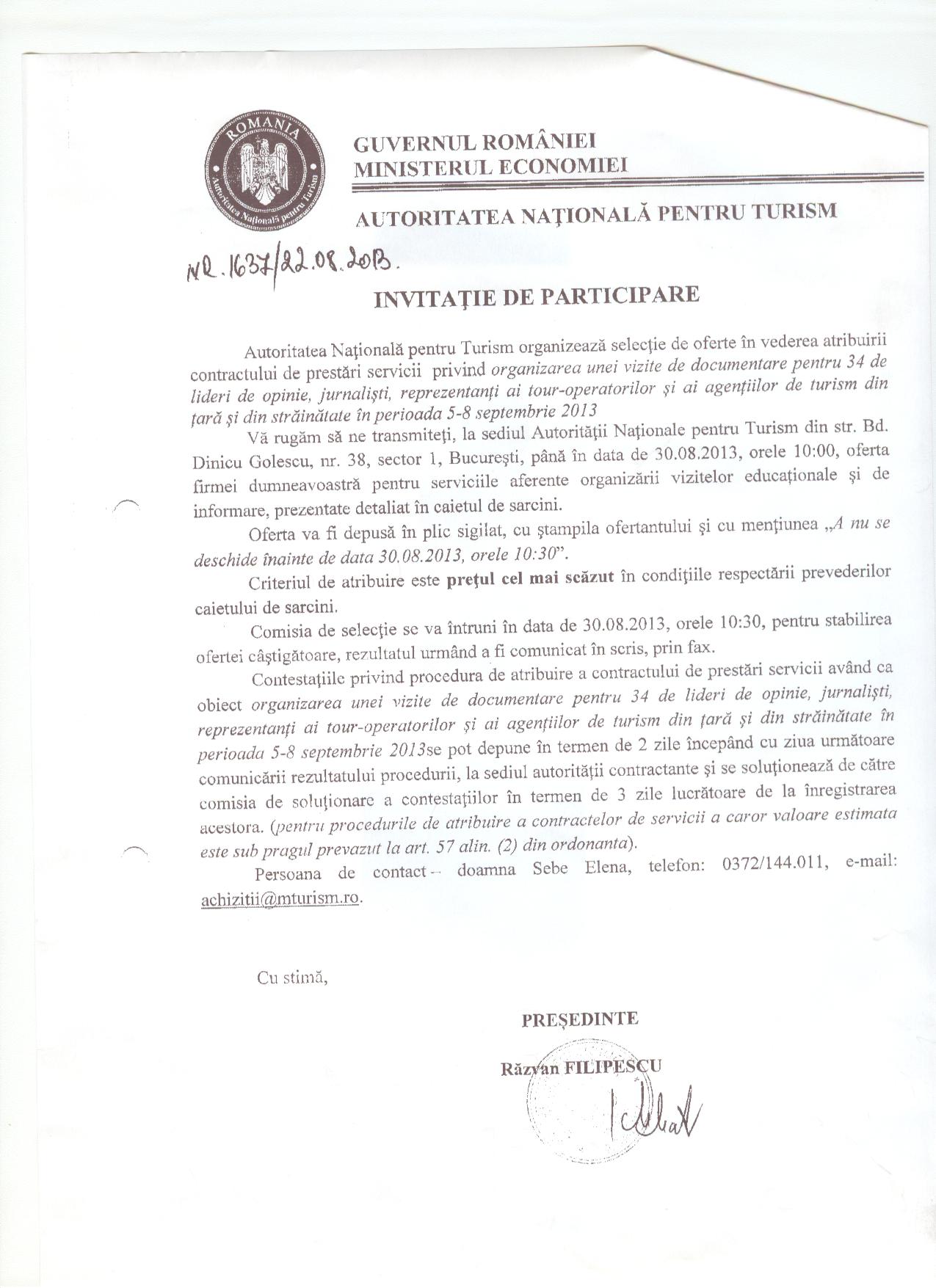 Invitatie privind selectia de oferte in perioada 05-08 sept 2013 sub conducerea ANT